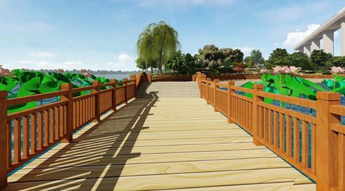 以荷花為主題,堤岸打造木棧道,河岸搭配蘆葦?shù)戎参铮浞职l(fā)揮綠地效益。